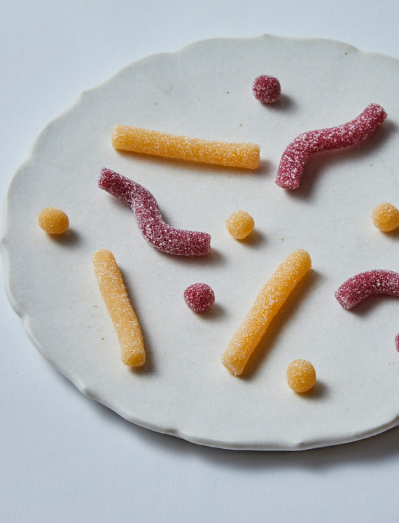 和三盆のやさしい甘さに、杏にはオレンジゼスト、サワーチェリーにはバラを合わせ、シャリっとほどける食感と果実の香りが広がります。 贈り物にもふさわしい小さなアートピースのようなひと品です。A modern “fresh rakugan” shaped with fruit and fragrance—
